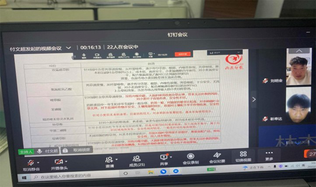 3月16日鲁供丰农公司进行小麦除草与病虫害预防视频会议培训,会议通过钉钉视频会议进行除草剂(套餐2禾阔双除型除草剂)使用的专题培训。本次培训由质控部组织,主讲人为套餐2供货商---深圳雨燕技术人员。鲁供丰农公司及其业务人员下班后通过视频学习更多的除草剂知识,增强农业种植相关技能,为正在进行的春耕备耕活动提供了强有力的农技知识保障。